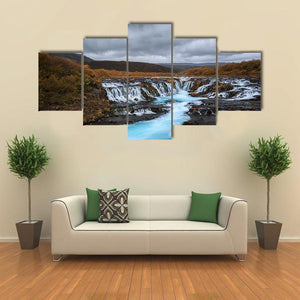 A photographic landscape of a vivid blue waterfall and river set among rocky terrain and distant mountains beneath an overcast sky. Motion blur in the water and layered depth give the image a dramatic yet serene, powerful feeling. Suited to modern or nature‑inspired rooms and simple, calm interiors.