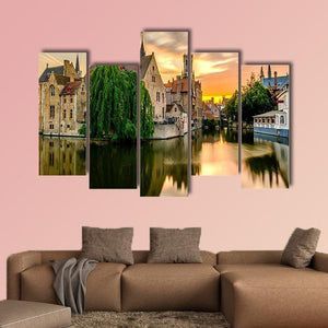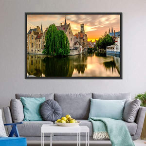 Bruges Cityscape With Canal depicts a calm canal scene with historic buildings, a weeping willow, and a distant bell tower. Rendered in a realistic style with warm yellow and orange tones and touches of green and brown, it evokes a serene golden-hour mood. Suited to modern or nature-inspired rooms as a peaceful, colorful wall art accent.