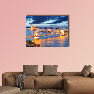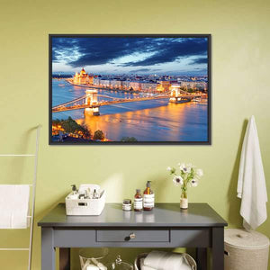 This vibrant canvas print captures the essence of Budapest with a stunning aerial view of its iconic skyline. Featuring the majestic Chain Bridge and the Parliament building, it showcases a dynamic palette of blue, yellow, and orange, creating a lively scene that enhances any decor.