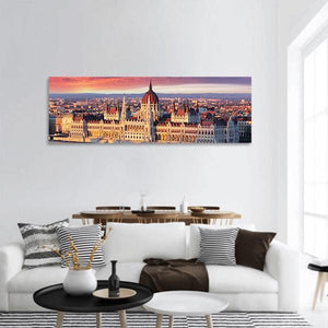 This panoramic canvas shows Budapest’s Parliament building and the riverside skyline beneath a warm sunset sky. Realistic details—from the dome architecture to ornate buildings—are rendered in orange, pink, purple and blue tones for a majestic, vibrant mood. It suits modern interiors and room decor that favor cityscape art.