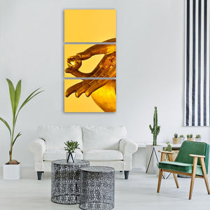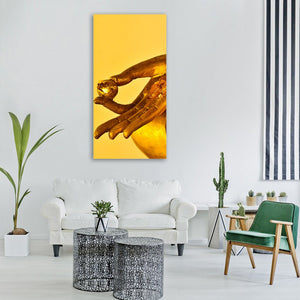 This canvas art features a stunning close-up of golden Buddha hands, conveying a serene and luxurious vibe. The intricate texture and vibrant yellow palette invite a spiritual atmosphere, perfect for enhancing peaceful spaces.