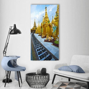 This canvas shows golden stupas and temple figures from a Myanmar pagoda, captured in a low-angle, realistic composition that feels spiritual and majestic. Vibrant gold and blue tones, ornate spires, and stone guardian figures create a serene, awe-inspiring atmosphere suited to quiet or sacred corners of the home.