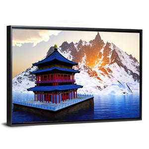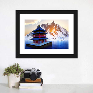 This canvas art captures a serene Buddhist temple nestled among majestic, snowy mountains and a calm lake. The realistic depiction of a multi-tiered pagoda, bathed in sunlight, invites a sense of peace and tranquility to your space.