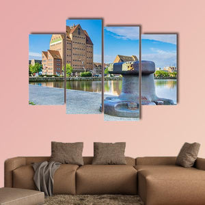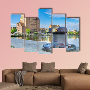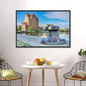 Building in Harbor of Rostock depicts a large brick building beside a dock, with a metal bollard in the foreground beneath a clear blue sky. The realistic, rule-of-thirds composition and a palette of blues, browns and greys create a calm, sunny urban mood. It suits modern or coastal living spaces and room decor that favor quiet architectural scenes.