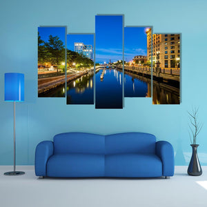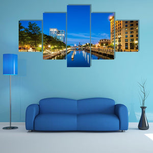 This canvas art captures a serene cityscape featuring a canal framed by tall buildings under a tranquil night sky. The calming palette of blue and yellow reflects lights dancing on the water, adding an urban charm to your décor.
