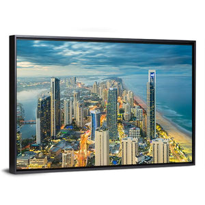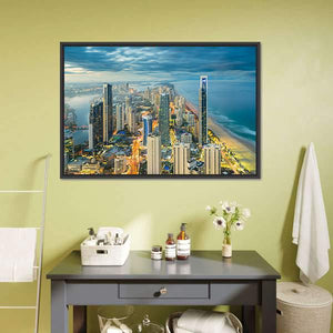 Buildings At Riverside captures a city skyline along the river and coastline at twilight, viewed from an aerial perspective. Cool blues and grays meet warm orange highlights to create a modern, urban mood. It works well in contemporary living rooms or home offices.