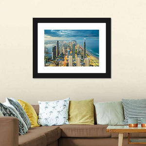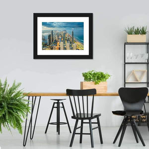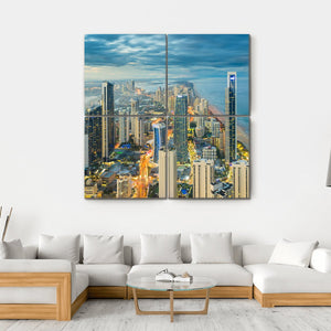 Experience the vibrant energy of a coastal city skyline with our Buildings At Riverside canvas wall art. This lively piece features a stunning aerial view of skyscrapers against a backdrop of blue skies and soft clouds, capturing the essence of a bustling urban environment at night.