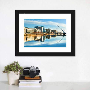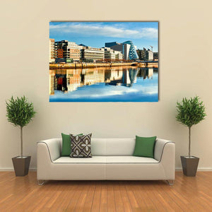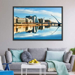Dublin cityscape with modern buildings mirrored in the river, rendered in a calm, bright photorealistic style. Blue, orange and neutral tones create a clean, modern look that suits contemporary living rooms or office walls.