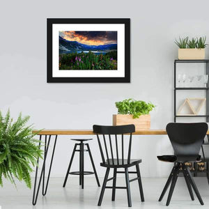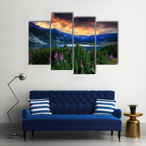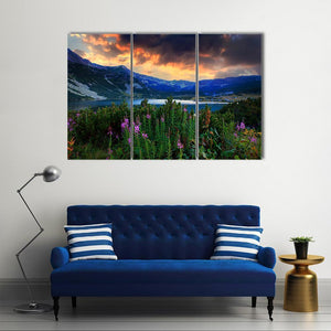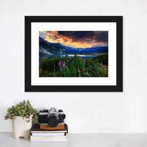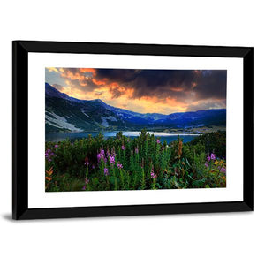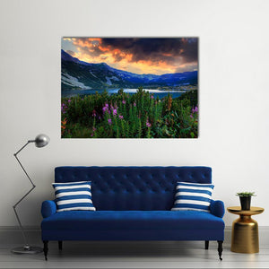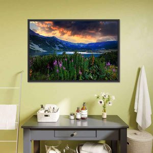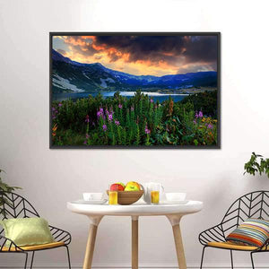 This stunning canvas features a serene mountain lake surrounded by vibrant wildflowers and a dramatic sky. The photorealistic style captures the awe-inspiring colors of blue, green, and orange, making it a captivating focal point for any space.