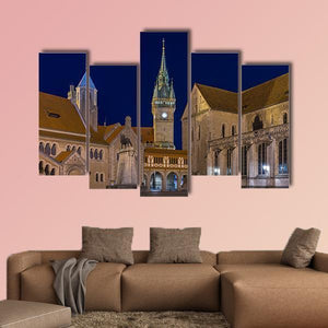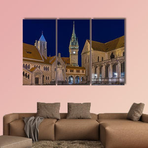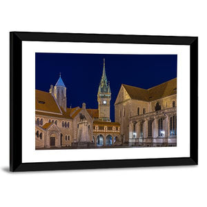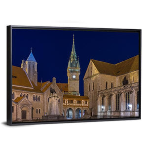 Braunschweig At Evening depicts historic buildings and a clock tower under evening light, with illuminated facades and pointed spires. The realistic cityscape uses blue, brown, grey, and white to create a grand, serene atmosphere. It pairs well with modern room decor as a quiet focal point.