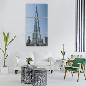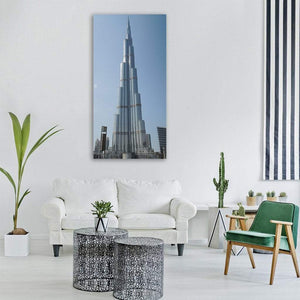 Featuring the Burj Khalifa and the Dubai skyline in a low-angle, full-view composition, this canvas presents a photorealistic, modern cityscape with a majestic, grand mood. Rendered in blues, silver, grey and white beneath a clear daytime sky, it pairs well with contemporary living rooms or office walls that favor modern city imagery.
