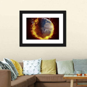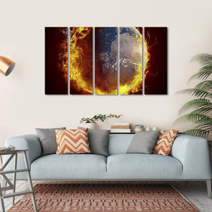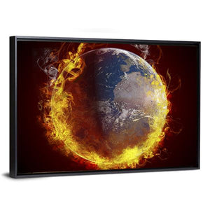 This striking canvas art depicts a dramatic scene of planet Earth engulfed in fire and smoke. The intense colors of red, orange, and yellow create an alarming atmosphere, highlighting urgent themes of global warming and environmental concern.
