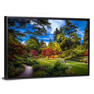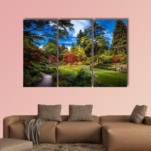 A realistic, vibrant landscape showing a winding brick garden path through lush grass and layered trees with a prominent red-leafed tree at the center. The daytime scene feels serene and peaceful, with green, red and blue tones that suit modern, nature-focused room decor.