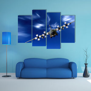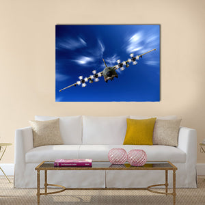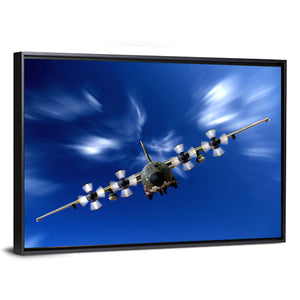 C130 Military airplane speeding over a cloudy blue sky Canvas Wall Art is designed to resonate and spark a mix of feelings. Whether you love art or just looking to decorate your home, this striking and powerful canvas print is an eye-catching decor element that can't go unnoticed.
