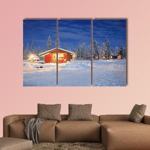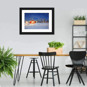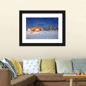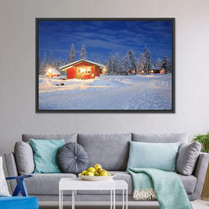 Cabin Hut In Winter depicts a centered snowy landscape with a cabin, snow-covered trees and glowing windows beneath a dusky night sky. Cool blues and whites, with hints of red and green, give the scene a cozy, serene winter atmosphere. The rustic image pairs well with modern or rustic room decor as a calm wall focal point.