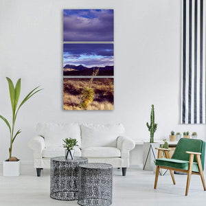 A realistic desert canvas that centers a blooming yucca with distant mountains and storm clouds, composed using the rule of thirds. Purple and blue tones with brown, green and yellow accents create a dramatic, moody, arid atmosphere. Works well in modern or nature-inspired rooms as a focal wall piece.