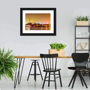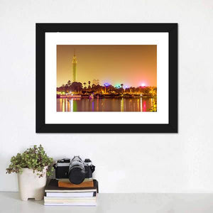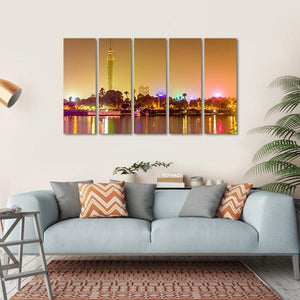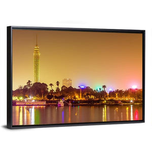 This canvas art captures the vibrant skyline of Cairo at evening, showcasing a tall tower and the shimmering river below. Its photorealistic style uses a rich palette of gold, blue, green, and purple to create an illuminated, urban atmosphere.