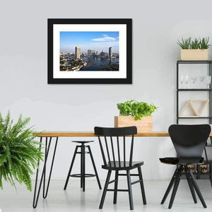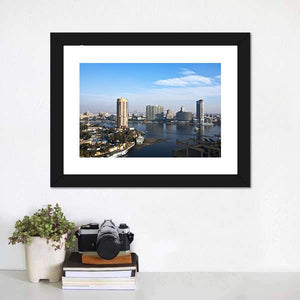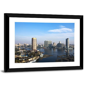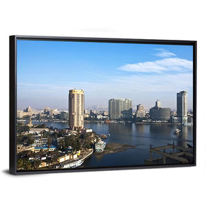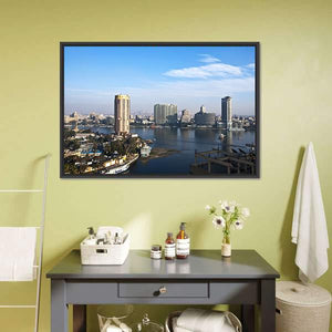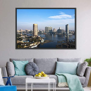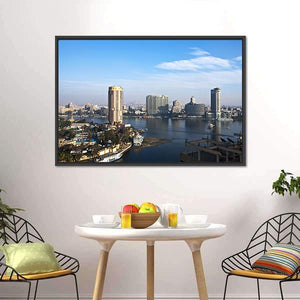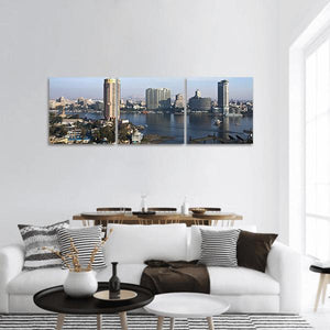 This panoramic canvas art captures the serene skyline of Cairo, featuring tall buildings and the peaceful river with boats gently gliding by. Its realistic style and soothing palette of blue, grey, and brown make it an excellent addition to contemporary living spaces.