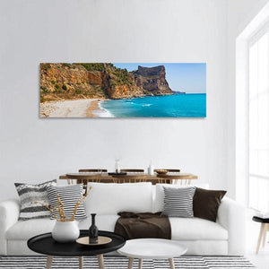 Cala Del Moraig Beach captures coastal cliffs, a sandy shore, and turquoise water in a wide panoramic view. The photorealistic image and blue, brown, green, and tan palette create a serene, natural mood. It pairs nicely with coastal or modern room decor as a calm focal piece.
