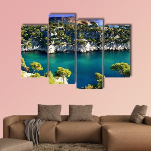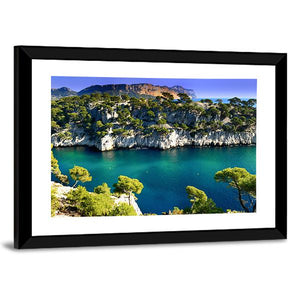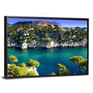 Massif Des Calanques Canvas Wall Art depicts coastal cliffs, calm blue water, and pine trees in a realistic landscape. Its serene, natural mood and cool blue-green palette make it a good fit for modern or coastal-inspired rooms.