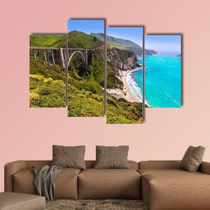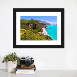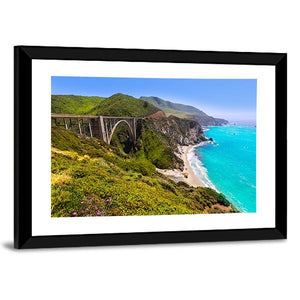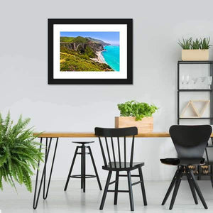 California Bixby Bridge sits above turquoise water in a realistic coastal landscape. The composition uses rule of thirds and depth to highlight the arched bridge, grassy hills and distant mountains for a serene, scenic, majestic feel. It suits modern room decor and works well as a calm focal piece for living rooms or offices.