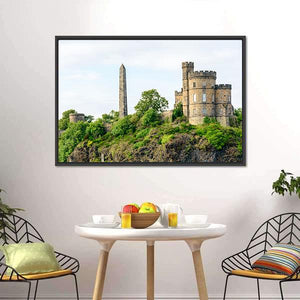 Calton Hill in Edinburgh shows a realistic landscape of a fortified tower and stone obelisk on a green hillside. Composed with the rule of thirds from an elevated daytime viewpoint, it carries a historic, scenic atmosphere. The piece suits living rooms or studies and complements green, brown, gray, and blue color schemes.