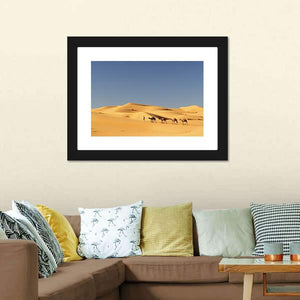 Camels In Desert Panoramic Canvas Wall Art shows a line of camels and a person crossing sunlit dunes, with golden yellows, browns and touches of blue that convey a tranquil, vast, adventurous mood. The realistic panoramic composition emphasizes wide-scale landscape and works well in modern interiors as a calm focal piece.