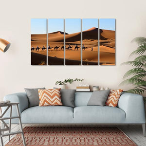 This canvas art captures a tranquil scene of a camel caravan crossing vast desert dunes. The realistic portrayal uses a palette of tan, blue, and brown, evoking feelings of adventure and serenity. Ideal for enhancing any nature-inspired décor.