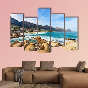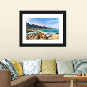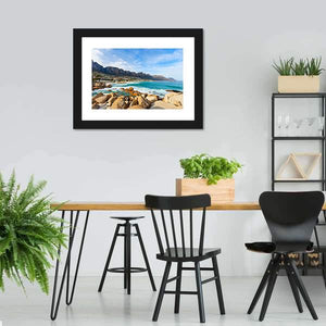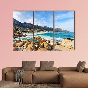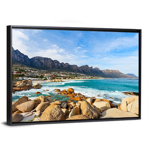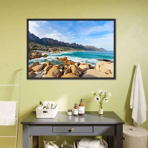 Camps Bay, Cape Town captured in a photorealistic landscape that feels serene and vibrant, showing the beach and ocean framed by mountains and rocky boulders. Waves break against the foreground rocks and a town nestles at the mountain base, a picturesque scene that suits coastal or modern living spaces.