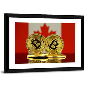 This canvas features a striking image of two bitcoin coins stacked in front of the Canadian flag. The bold red and white colors reflect a modern, financial vibe, making it a unique addition to any contemporary space.