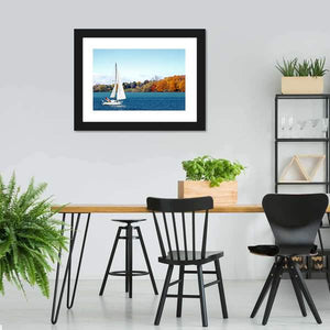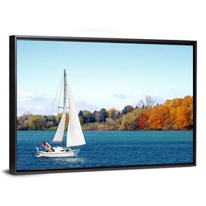 This panoramic canvas shows a sailboat with white sails and a Canadian flag gliding across calm water, set against vibrant autumn trees. The wide-angle, realistic scene feels serene and peaceful with a palette of blue, white, orange, green, and brown. It suits modern or nature-inspired interiors and pairs well with blue and warm autumn tones.