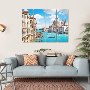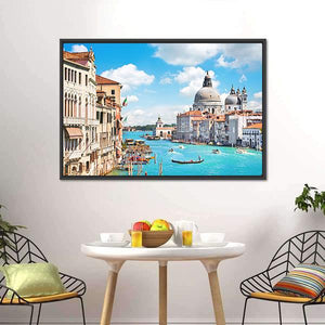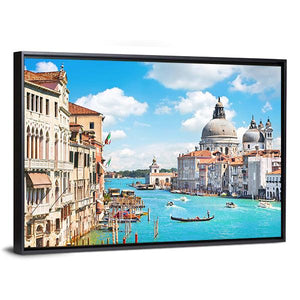 This vibrant canvas art captures the iconic Venice canal and the historic Basilica di Santa Maria. With a lively palette of blue, tan, and white, it's perfect for adding a sunny touch to your decor.