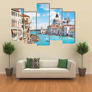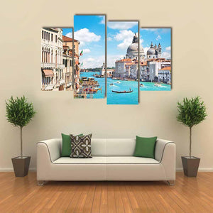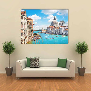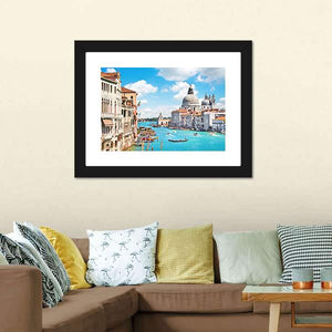 Experience the charm of Venice with this vibrant canvas art featuring the picturesque Canal Grande and the Basilica di Santa Maria. The artwork captures historic buildings and gondolas under a sunny sky, creating a serene yet lively atmosphere.