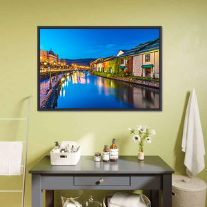 Otaru Canal Canvas Wall Art shows a quiet canal with illuminated waterfront buildings and gentle reflections on the water. The realistic night scene, rendered in blue and gold tones with touches of green, brings a serene, romantic mood that fits modern living rooms or bedrooms.