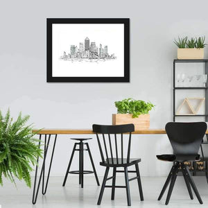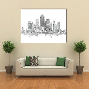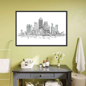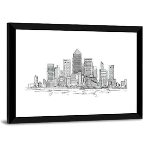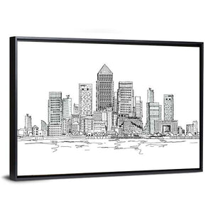This horizontal canvas features a detailed sketch of London's iconic skyscrapers and waterfront, capturing an urban, modern vibe. The minimalist black and white palette adds a clean touch, making it a striking addition to any wall decor.