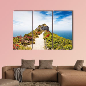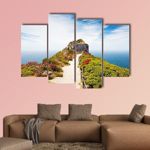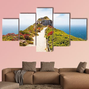 Cape Point in South Africa captures a winding coastal path leading to stone ruins above the ocean, set among dense green and red vegetation. Rendered in a realistic, vibrant palette of greens, blues, whites and browns, the scene feels serene, adventurous and expansive. A natural fit for modern living rooms or nature-themed spaces.