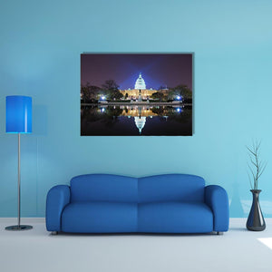 This canvas captures the majestic Capitol Building surrounded by a serene night sky. The striking reflection in the water and the illuminated dome create an iconic and tranquil atmosphere, making it a perfect addition to any wall decor.