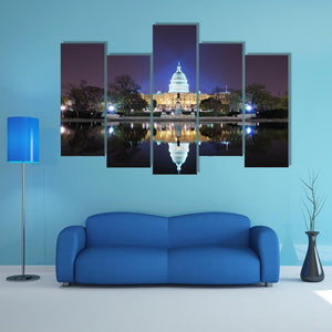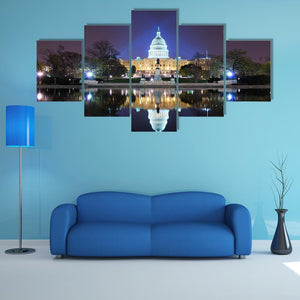 This photorealistic canvas art features the majestic Capitol Building illuminated at night, reflecting beautifully on the water. With a palette of deep blues, yellows, and blacks, it evokes serenity and adds a captivating touch to any space.