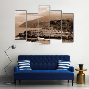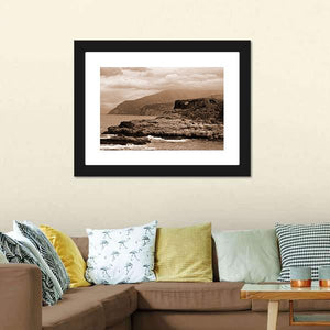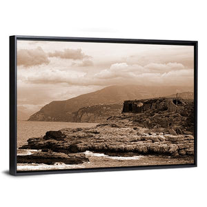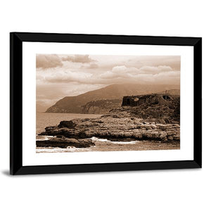 This canvas art features the serene beauty of a rocky coastline, complemented by ancient stone ruins against a backdrop of mountains and ocean waves. The vintage sepia palette adds a dramatic touch, perfect for creating a peaceful atmosphere in any space.