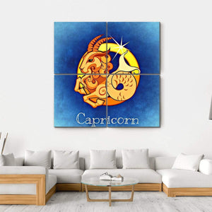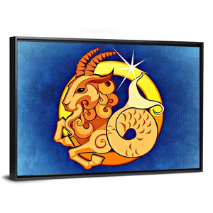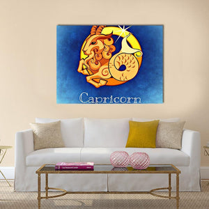 Celebrate your astrological side with this vibrant Capricorn canvas art. Featuring a stylized sea-goat against a rich blue backdrop with a glowing yellow crescent moon and star, this piece brings a symbolic touch to your space.