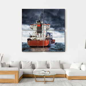 This canvas art features a powerful cargo ship navigating through rough seas under a dramatic, stormy sky. The deep blues and grays of the ocean contrast vividly with the ominous dark clouds above, creating a striking and realistic scene.