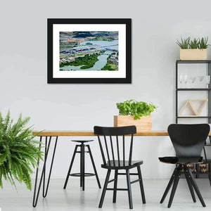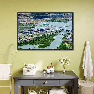 This artwork captures the bustling scene of cargo ships navigating the Miraflores Locks in Panama. The expansive view showcases vibrant shipping containers, industrial buildings, and man-made waterways amidst a backdrop of lush greenery. Perfect for adding a touch of industrious charm to your space.