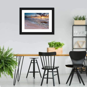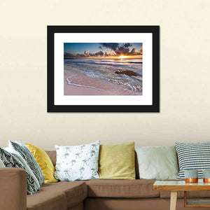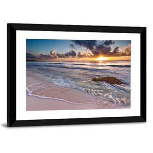 Caribbean coastline sunrise with a sun peeking through clouds and a wave breaking on the shore, captured in a photorealistic landscape. Warm oranges and pinks balance ocean blues to create a serene, peaceful morning mood. A natural fit for coastal or modern living spaces and bedrooms.
