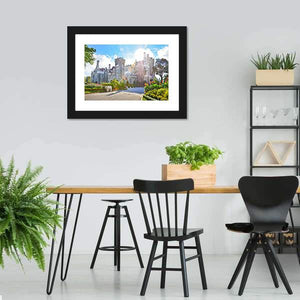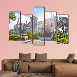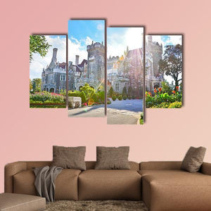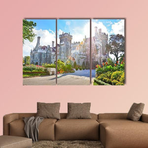 This canvas depicts Casa Loma’s castle and gardens bathed in bright sunlight, with Gothic architecture and a subtle lens flare. Rendered realistically in gray, green, blue and yellow tones, it gives a grand, sunny, historic mood that suits modern living rooms and entryways.