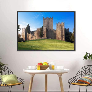 Castelo de Guimaraes Canvas Wall Art shows a stone castle with crenelated battlements standing on a green grassy hill, set against a bright blue sky and tall evergreen trees. Rendered in a realistic landscape style, the scene feels historic, grand, and serene. It suits living rooms, studies, or hallways that favor place-inspired or classic decor.