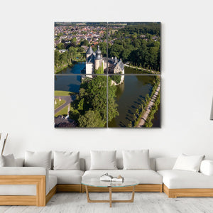 Capture the beauty of Castle Gemen with this serene canvas wall art. The picturesque scene features a historic castle surrounded by a tranquil moat, lush trees, and suburban houses in the background, offering a peaceful atmosphere for any room.