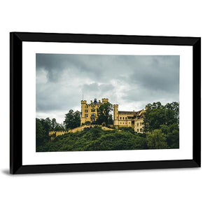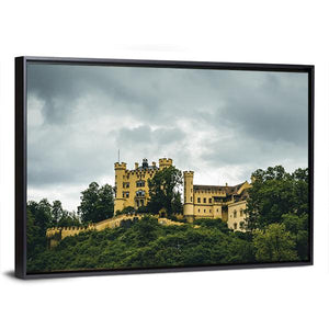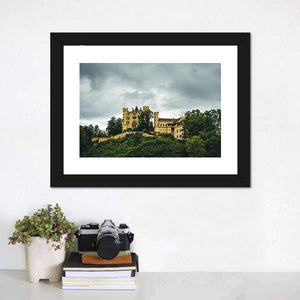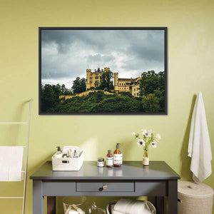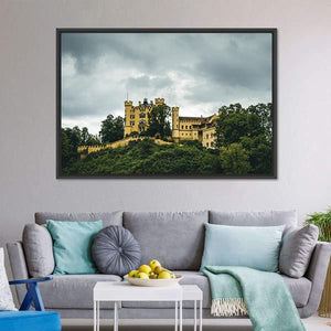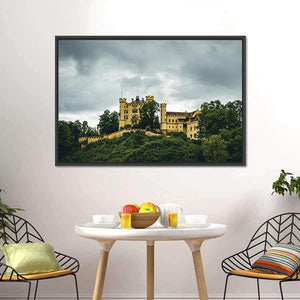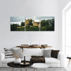 A realistic panoramic canvas of a yellow castle perched on a lush green Bavarian hill under a cloudy sky, capturing a serene, historic mood. This landscape print brings calm to modern rooms and living areas that favor subtle, nature-inspired decor.