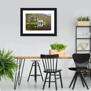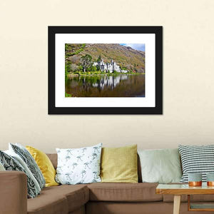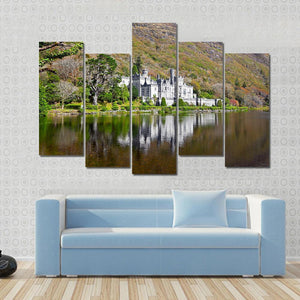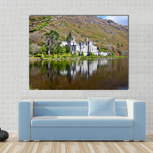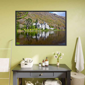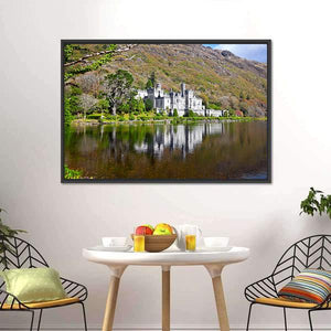 This landscape canvas art features the majestic Kylemore Abbey reflecting on serene waters. With a palette of greens, greys, and browns, it adds a tranquil vibe to any space.