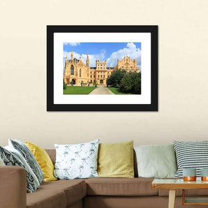 Castle Lednice Canvas Wall Art depicts the Lednice castle in the Czech Republic beneath a sunny, bright sky. The realistic landscape highlights ornate spires, large windows, lush green lawn and fluffy white clouds in a centered, symmetrical composition, a piece that fits both classic and modern interiors.