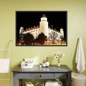 Bratislava Castle Canvas Wall Art shows the castle’s illuminated turrets and red-tiled roofs under a calm night sky. The realistic landscape uses a rule-of-thirds composition to create a historic, majestic mood that fits modern room decor.